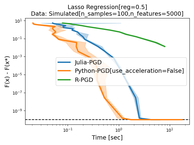 benchopt: Language Comparisonbenchopt can also compare the same algorithm in different languages.