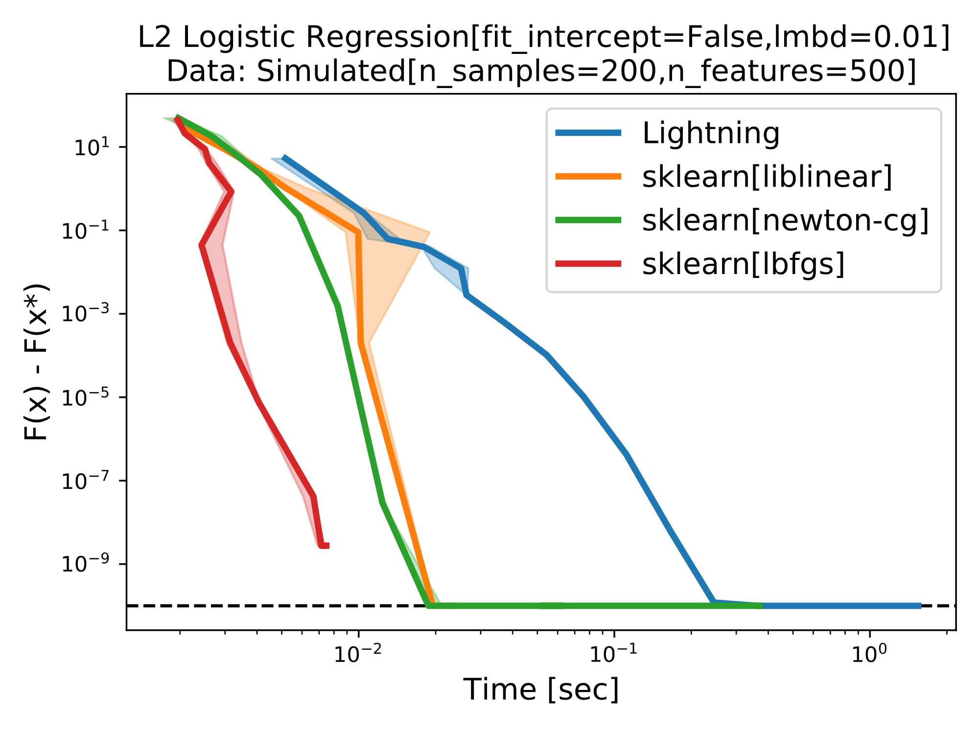 Doing a benchmark for the \(\ell_2\) regularized logistic regression with multiple solvers and datasets is now easy as calling:
